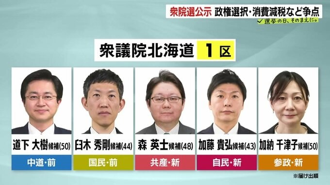 北海道1区は、札幌市中央区、南区、そして西区と北区の一部が選挙区で、 5人が立候補しています。