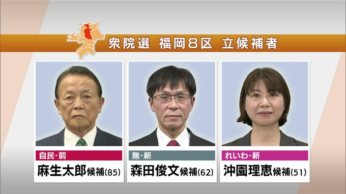 【衆議院選挙】立候補者 福岡選挙区42人 佐賀選挙区5人 RKB毎日放送 2026年1月27日(火) 20:29 国内 暮らし・マネー 福岡8区 福岡8区は自民党の前職、無所属の新人、れいわ新選組の新人の3人が立候補しています。 【自民・前】麻生太郎 候補(85) 【無・新】森田俊文 候補(62) 【れいわ・新】沖園理恵 候補(51)