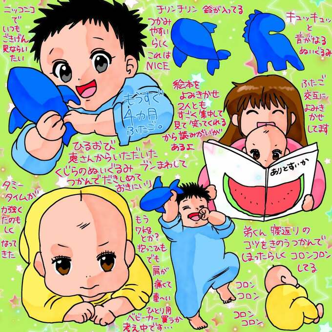 投稿された絵日記では、生後4か月を迎える双子の男児の日常が描かれています。「絵本をよみきかせ 2人ともすごく集中して見て笑ってくれるから読みがいがあるよ」と記しています。