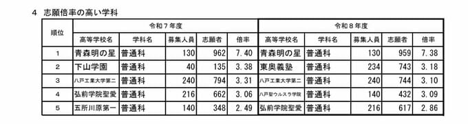 青森県私立高校入試2026 志願倍率 青森明の星(普通)7.38倍 東奥義塾(普通)3.18倍 八戸工業大学第二(普通)3.10倍 弘前学院聖愛(普通)2.86倍など【全校・全学科掲載 高校受験】 青森テレビ 2026年1月27日(火) 14:15 国内 令和8年度青森県私立高等学校入学者選抜に係る志願状況について(県民活躍推進課の資料より)