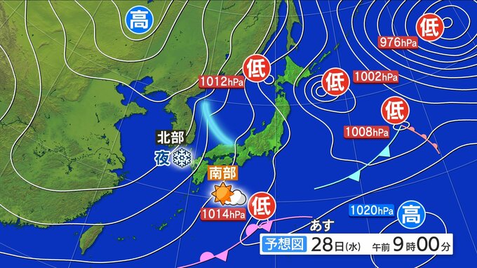 28日(水)おおむね晴れ 北部は雲多く 夜は雪地点も