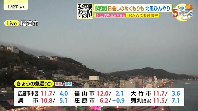 きょう27日(火)の広島県内は、朝は雲が広がりやすくなりましたが、日中は南部では晴れ間が広がり、穏やかな陽気になりました。最高気温は、広島市中区で11.7℃まで上がりました。各地きのうと比べると2℃~3℃ほど高くなりました。