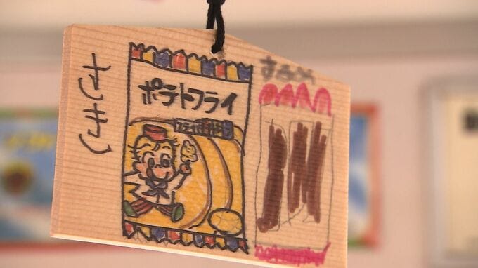 さらに、岡山市内の園児たちが好きな駄菓子のイラストを描いた絵馬もしつらえられています。