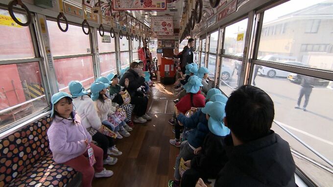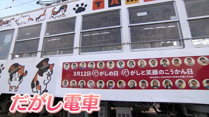 (佐藤大祐記者)「『だ』という文字のヘッドマークを取り付けたこちらの路面電車。中に入ってみると…、駄菓子のパッケージをプリントした紙がたくさん飾り付けられています」