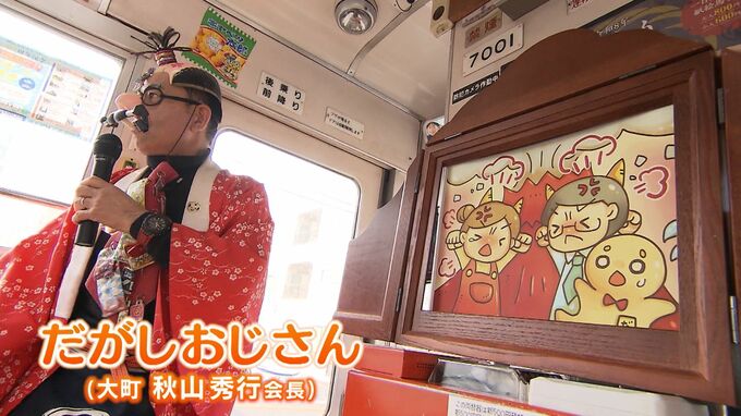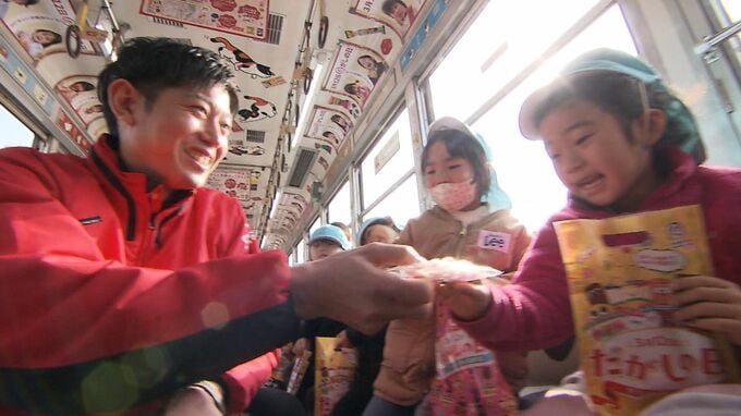 車内では、大町の会長、秋山秀行さんが扮する「だがしおじさん」が何の駄菓子が描かれているかをあてるクイズ形式の紙芝居を披露したり、駄菓子をプレゼントしたりして、園児たちを楽しませていました。