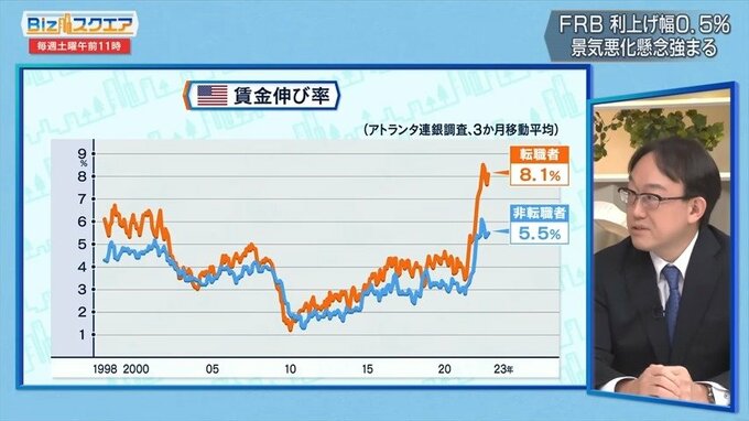 ちょっと前の講演でパウエル議長は今のインフレの状況を3つに分解して、モノに関してはサプライチェーンの混乱もだいたい終わってきたからここから先下がっていくと。家賃関連も来年は下がってくるでしょうと。ただ家賃を除いた残りのサービス、これはインフレ全体の55%ぐらいを占めているのですが、ここがまだ心配だと。これは賃金をすごく反映するので、こんなに利上げしているのに賃金の伸びがまだ思ったように下がってこないと。