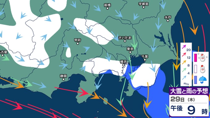 大雪などの予想シミュレーションをみてみると、“第2波”の寒波が来る時期である29日~30日頃には東京や埼玉、神奈川、千葉でも雪になる時間帯があることが予想されており、今後も最新の気象情報に留意してください。
