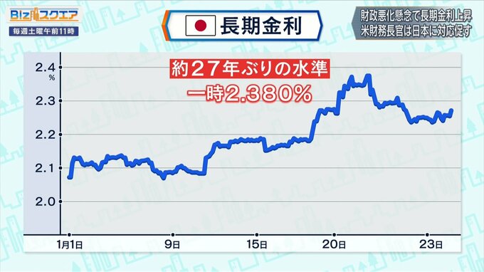 消費税減税による財政悪化の懸念から債券売りも加速。20日、長期金利の代表的な指標である「10年物国債の利回り」は、一時2.380%と27年ぶりの高い水準に達した。
