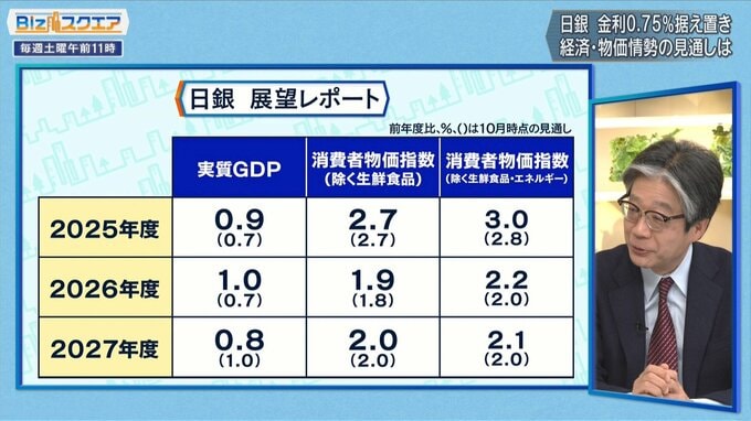 「植田総裁の言う“基調的な物価”というのは、消費者物価指数(除く生鮮食品・エネルギー)だと思うが、それは25、26、27年度といずれも上振れさせてきている。元々日銀は、特に除く生鮮・エネルギーでも緩やかに物価が下がって2%を切っていくと考えていたが、今回の数字を見る限りでは、そうはならないと判断を変えてきてるのかなと」