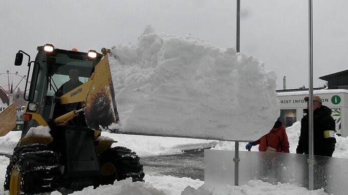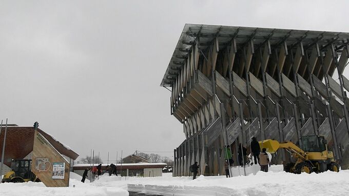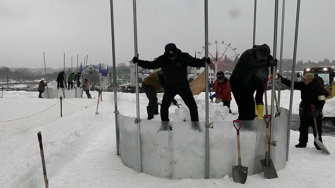 直径3.5メートル、高さ3メートルの巨大なかまくらの製作は、まつりの会場の1つ、「グリーナブルヒルゼン」で始まりました。