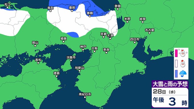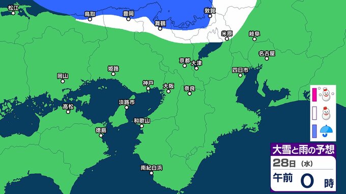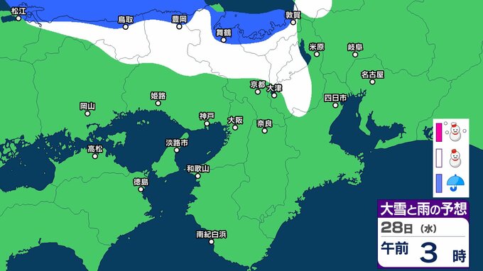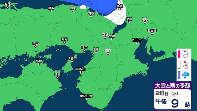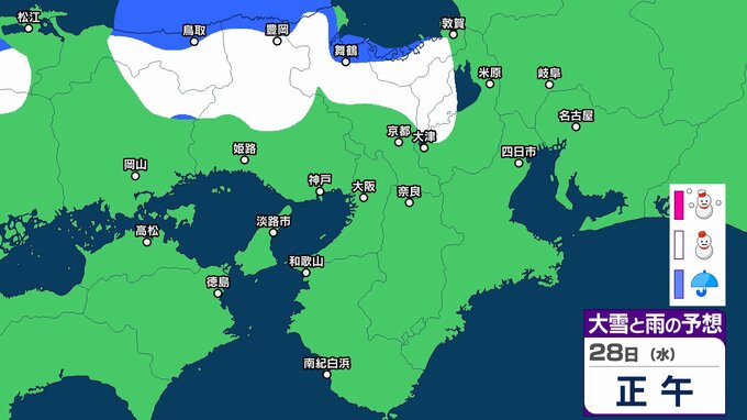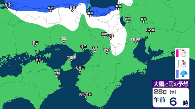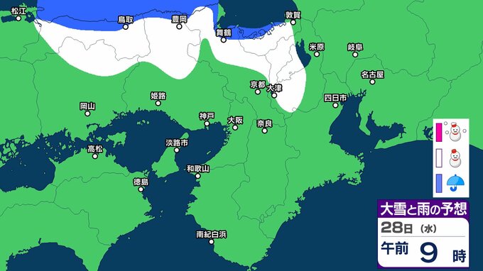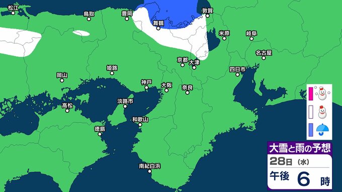 28日の京都府は、寒気や湿った空気の影響で曇り、北部では朝晩は雪や雨が降る見込みです。南部でも朝まで雪の降る所があるでしょう。