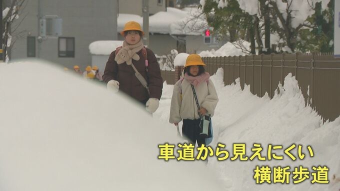 田上小学校では27日、教職員8人が雪で歩道が埋もれている場所や、積みあがった雪で車道から見えにくい横断歩道など、危険な箇所に立って児童の登校を見守りました。