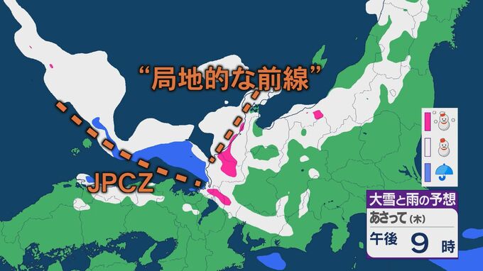 あす28日の午後から雪が降り出し、特に29日には降り方が強まりそうです。JPCZはまだ予想に幅がありますが、先週末と同じように県内の沿岸に前線が形成され、警報級の大雪となるおそれがあります。