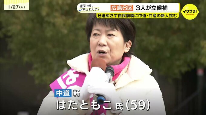 【衆議院選挙】広島6区には3人が立候補を届け出 各候補者の第一声【広島6区】 中国放送 2026年1月27日(火) 17:35 国内 中道改革連合・新人 はた ともこ氏(59) 「福山の様々な課題、何よりも平和を守り抜く、非核三原則の堅持、これは自民党には言えないことであります。福山から世界に向かって平和を発信していく。そののろしを皆さまとともにここ福山からあげていきたい」