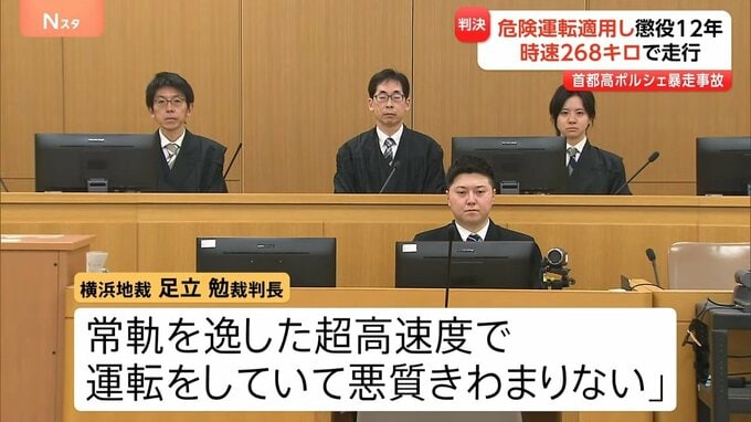 検察側は懲役15年を求刑していましたが、きょうの判決で横浜地裁は、「ひとたび事故が起きれば人を死亡させる可能性が高い、常軌を逸した超高速度で運転をしていて悪質きわまりない」として危険運転致死罪を適用し、懲役12年の判決を言い渡しました。