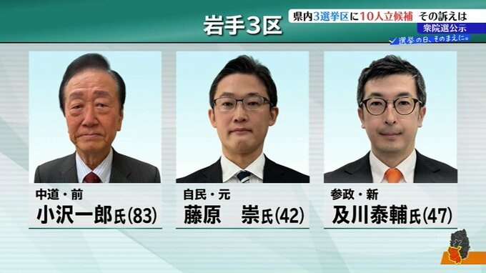 内陸南部の7つの市と町を範囲とする岩手3区は、中道改革連合の前職・小沢一郎(おざわ・いちろう)氏と自民党の元職・藤原崇(ふじわら・たかし)氏、参政党の新人・及川泰輔(おいかわ・たいすけ)氏の3人が立候補しました。