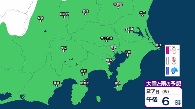 【東京の雪予想】冬型の気圧配置が強まる見込み→29日(木)東京・横浜・千葉など首都圏の広い範囲に雪雲が… 27日(火)~2月1日(日)東京・横浜・千葉・埼玉・つくば 関東甲信地方の雪雨シミュレーション【気象庁 27日午後6時】 RSK山陽放送 2026年1月27日(火) 18:17 国内 天気 27日(火) 気象庁によりますと、27日は、高気圧に緩やかに覆われますが、低気圧が三陸沖に進み、気圧の谷や湿った空気の影響を受ける見込みです。このため、晴れや曇りで、長野県や関東地方北部では雪の降る所があるでしょう。 1 2 ▶27日(月)~1日(日)雪雨シミュレーション