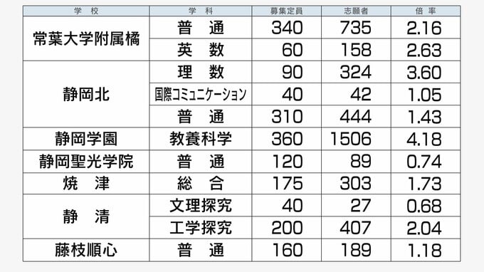 常葉大学附属橘は英数科が2.63倍、静岡北は理数科が3.60倍です。定員360人に1,506人が出願した静岡学園の教養科学科が4.18倍と高倍率です。また、新たに中高一貫校の静岡聖光学院が募集を開始しました。焼津は1.73倍、静清は工学探究が2.04倍、藤枝順心は1.18倍となりました。