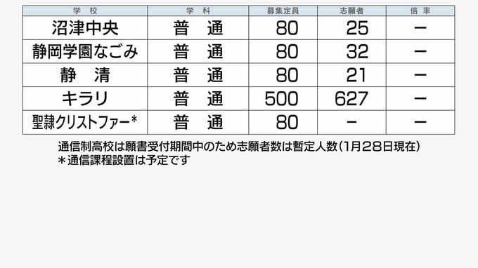 静岡県私立高校入試2026 志願倍率は磐田東(普通科)と浜松学芸(普通科)がともに4.22倍、静岡学園(教養科学科)4.18倍に【令和8年度高校入試 志願状況】 静岡放送 2026年1月28日(水) 20:00 国内 狭域通信制 通信制高校は1月28日現在、願書受付期間中のため、志願者数は暫定人数です。また聖隷クリストファーの通信課程設置は予定です。