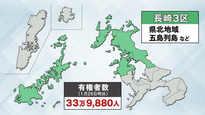 佐世保市など県北地域のほか五島市などで構成された「長崎3区」26日時点の有権者数は33万9880人です。「長崎3区」は、前職と新人による与野党一騎打ちとなりました。