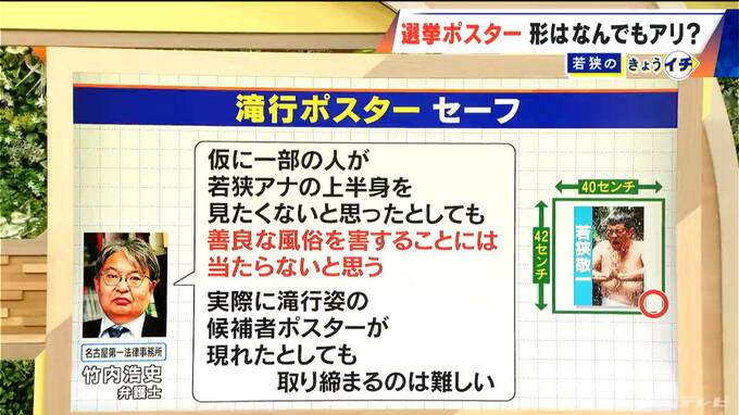 名古屋第一法律事務所・竹内浩史弁護士に聞いたところ、「仮に一部の人が若狭アナの上半身を見たくないと思ったとしても、善良な風俗を害することには当たらないと思う。実際に滝行姿の候補者ポスターが現れたとしても、取り締まるのは難しい」とのことでした。