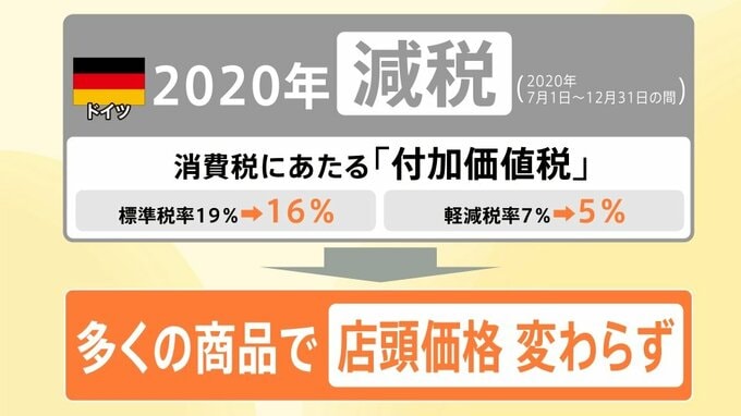 ドイツでは2020年(7月1日~12月31日の間)に、日本の消費税にあたる「付加価値税」の、標準税率を19%から16%に、軽減税率を7%から5%に減税しました。