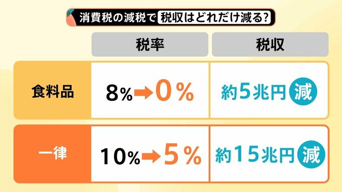 ▼食料品 8%→0%になると、税収は約5兆円減