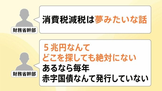 財務省幹部に取材をしてみると、「消費税減税は夢みたいな話」「5兆円なんてどこを探しても絶対にない。あるなら毎年、赤字国債なんて発行していない」という声が聞かれました。