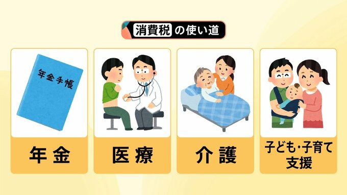 消費税は法律で使い道が決まっていて、社会保障の「年金」「医療」「介護」「子ども・子育て支援」の4つとなっています。