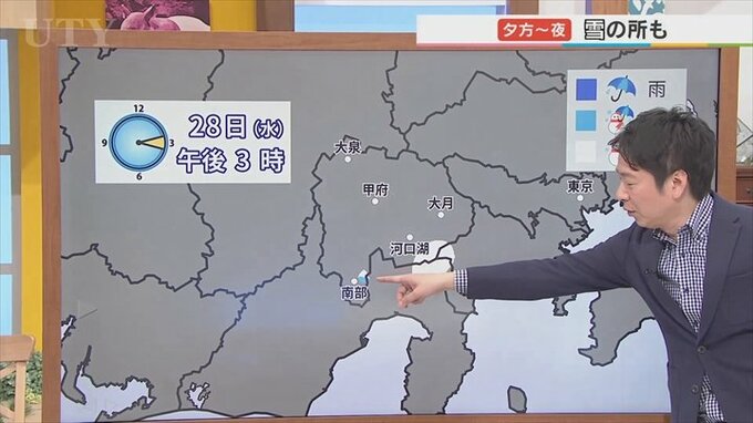 だんだん雪の範囲が広がる予想で、峡南や富士五湖方面で南から北へと盛り上がってる感じになっていますが、この辺り全域とまではいかないと思いますが雪が降りやすい場所と見ています。