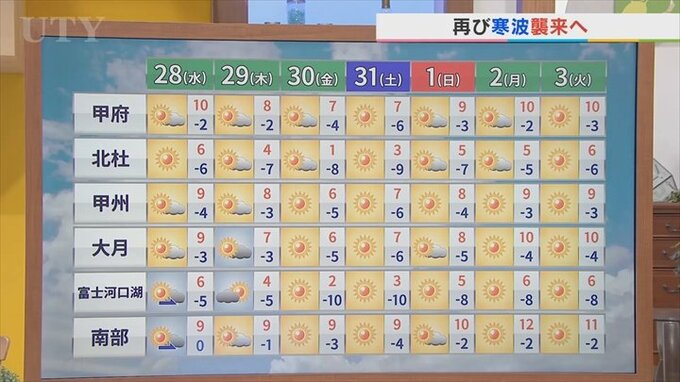 28日は日差し少なく天気下り坂で雪が降るところも 今シーズンは花粉が多い予想 米津龍一気象予報士が解説 山梨 テレビ山梨 2026年1月27日(火) 20:01 国内 天気 週間天気を見ていきますと、まだまだ花粉は飛ぶ予想はないですがこの先も晴れの天気が比較的続きやすくなります。 金曜日から土曜日寒波の影響を受ける見通しです。 <県内各地点のあすの天気は動画をご覧ください>