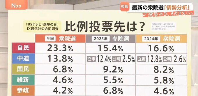 1月23日~25日の期間に、TBSテレビ「選挙の日」とJX通信社合同のインターネット調査を行いました。なお、「ゆうこく連合」が政党要件を満たす前に行われた調査であったため、「ゆうこく」の項目はありません。