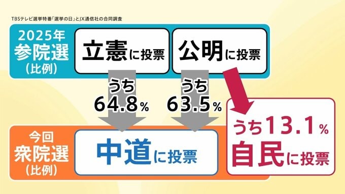 2025年参院選の立憲12.4%と公明2.5%を足してみると14.9%。今回の衆院選では13.8%ということで、1%ほど減っていることになります。