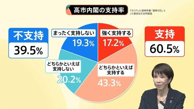 高市内閣については、▼「支持」が60.5%、▼「不支持」が39.5%と、高い支持率であることが分かります。