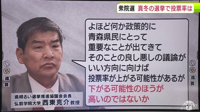 県明るい選挙推進協議会の会長で弘前学院大学の西東克介 教授は「よほど何か政策的に青森県民にとって重要なことが出てきて、そのことの良し悪しの議論がいい方向に向けば、投票率がもしかしたら上がる可能性があるが、どちらかといえば下がる可能性のほうが高いのではないか」と話しています。