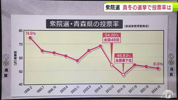雪が多いと投票に行くだけでも一苦労。このため投票率が下がってしまうという懸念もあります。過去の衆院選、青森県内の投票率はどうだったのでしょうか。