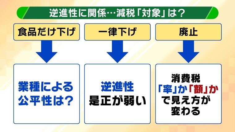 「廃止」とする案は、すべての商品の消費税をゼロにすることで強力な景気刺激策となる一方、結果的に恩恵を受ける額も高額所得者の方が多くなるという見方があり、果たして低所得者に向けた対策として適切かどうか意見が分かれています。