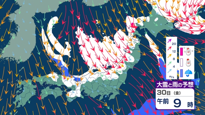 気象庁が発表する最新の「短期予報解説資料」の情報によりますと、発達する低気圧などのほか、強烈な寒気が東日本にまで南下することで、29日は北日本~西日本の日本海側を中心に広く降雪が強まる見込みで、大雪に注意・警戒が必要だということです。