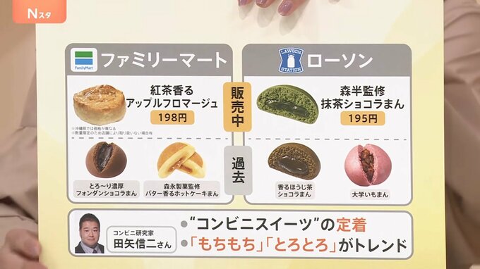 新商品も続々と登場していますが、コンビニ研究家の田矢信二さんによると、▼“コンビニスイーツ”が定着したことで、“スイーツ系”中華まんが注目されていて、トレンドは、▼「もちもち」「とろとろ」だということです。