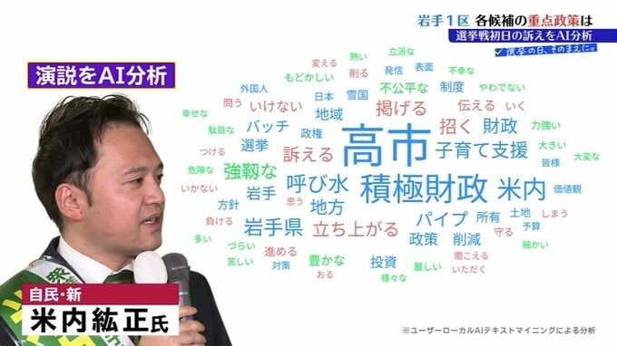 自民党・新人の米内紘正氏は高市政権が掲げる積極財政を推し進める必要性を強調するとともに、地方と都市との格差是正を訴えました。