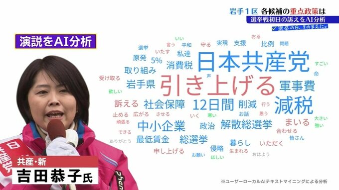 共産党・新人の吉田恭子氏は大企業への減税の見直しと軍事費の増額をおさえることで消費税を一律5%に減税することと、最低賃金引き上げを訴えました。
