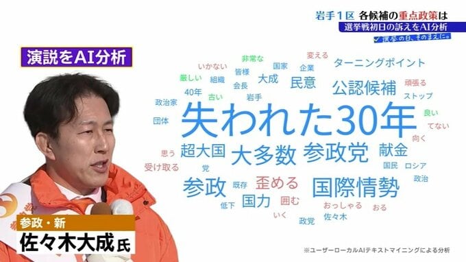 「企業団体献金に代表されるような特定の組織を向いている政治のためにですね、皆様の大多数の国民の民意が歪められてきたと私は思っています。だから、企業団体献金一切受け取ってない我々参政党がですね、真に国民の皆様の民意を受け取って、これ以上、失われた30年をここでストップさせて、40年にならないためにですね、ここ岩手から精一杯頑張っていく」