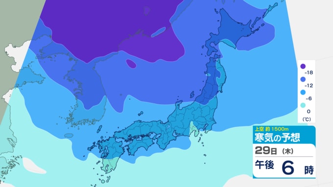 平地で雪になる目安(上空1500mで-6°C以下)強い寒気が日本列島をすっぽりと覆う見込みです。