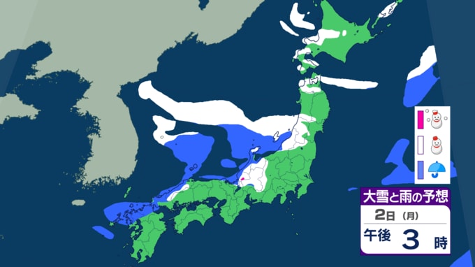 2月1日(日): 「南岸低気圧」が本州の南を東進します。九州から関東にかけての太平洋側でも雨や雪が降る予想です。低気圧のコース次第では、普段雪の少ない地域でも注意が必要です。