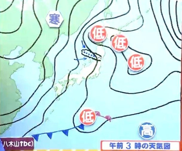 日本海のあたりでは、風と風がぶつかり合って、山形から宮城に伸びる雪雲のラインが伸びています。この雪雲のラインが南北に動き、雪雲がかかったところで雪が降るでしょう。