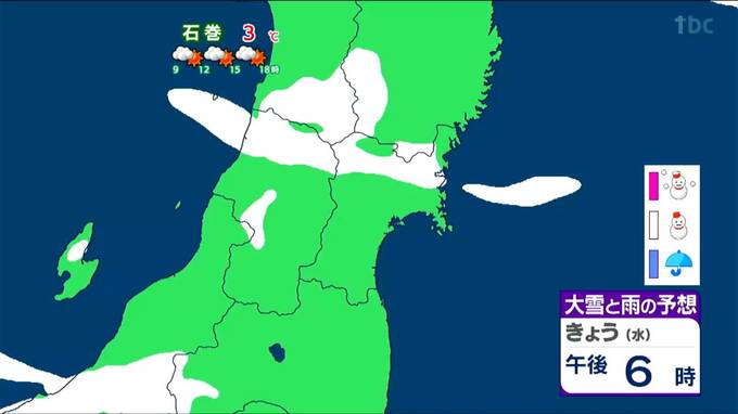 平地では日中の雪は積もることはありませんが、午後6時頃になると北部を中心に平地でも雪雲がかかりやすくなります。栗原市や登米市のあたりでは、この時間帯に気温が0℃以下となる可能性があり、積もりやすくなるかもしれません。車を運転される方はスリップに十分ご注意ください。