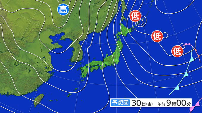 30日午前9時の予想天気図では、日本海の等圧線は縦にのび、その間隔が小さくなっています。北よりの風が日本海側では強まりそうです。