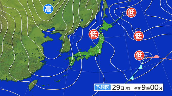 29日午前9時の予想天気図です。冬型の気圧配置で、日本海の西部には等圧線が西側に膨らんだ箇所があります。この部分で雪雲が発生、発達しそうです。