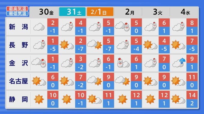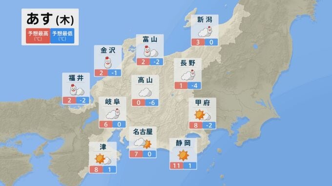 北陸では、29日は雪の降り方が強まりそうです。気温も低く、最低気温が氷点下の冬日が続きそうです。また、北よりの風が強まるでしょう。
