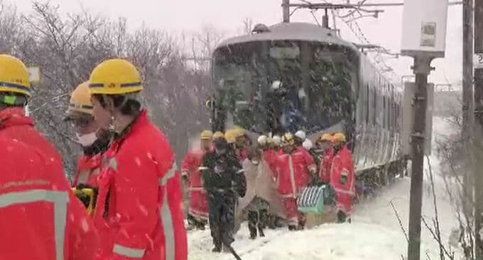 現場はJR七尾線の横山駅から北におよそ400メートルの踏切で、石川県がかほく市高松に設置した積雪計では、28日午前8時に22㎝の積雪を観測していました。